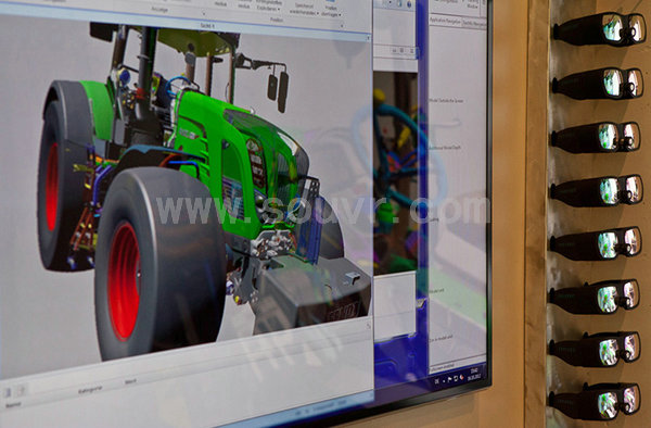 在面积5m x 2.6m立体投影墙上显示各种农机设备的CAD模型。系统主要设备是两台DLP投影机,ART追踪系统和大型背投投影屏。用户使用头部追踪眼镜观看模型,其他室内人员(最多20人)也可以使用追踪眼镜观看三维高清模型。