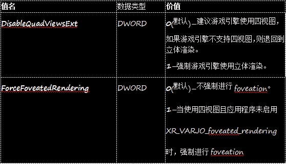 这些注册表设置实际上允许最终用户在表中的所有配置之间移动,只要应用程序支持带凹入的立体渲染(以前称为Varjo四视图)。