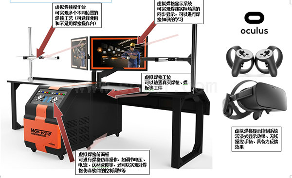 虚拟焊接综合仿真实训平台是新一代环保、节能、通用型操作技能实训与评价平台。本产品采用分布式仿真实训技术、虚拟现实技术、微机测控技术、声音仿真技术及计算机图像实时生成技术。在不需要真实焊机的情况下,通过仿真主控系统、位置追踪系统、声效显示系统和评定系统将焊接演练过程中焊枪的位置、速度、角度、操作信息等进行采集处理,并实时生成虚拟焊缝。